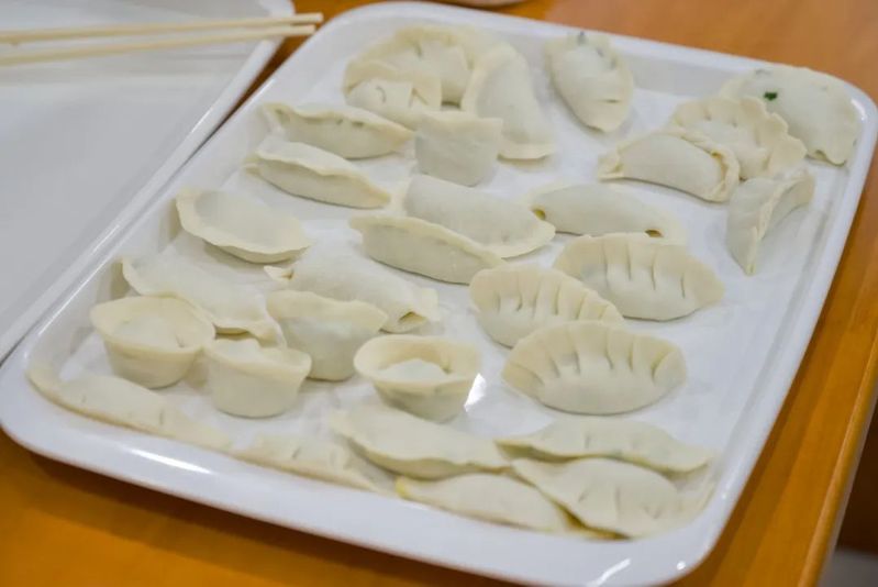 为了帮助大家包出好看的饺子,教工一食堂的卢经理展示了一种简易的东北饺子包法:放好肉馅后将面皮对折,先固定住面皮的中间一点,两手同时从两边往中间一掐,就是一只精巧的饺子。学会了饺子的包法,同学们在温馨愉快的氛围中一边包饺子,一边讨论学习生活、冬至习俗。