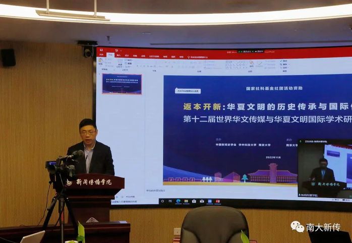 教授赵振祥发表《内省与外传——关于文化经典的对外传播思考》演讲,从分析中华传统文化经典出发,强调以科学精神把中华优秀文化传播出去。中央民族大学新闻与传播学院特聘院长、华中科技大学国家战略传播研究院教授张昆基于《寰球民意指数2020》,以实证研究的方法分析了南非公众对于中国形象的认知。大连外国语大学特聘教授、中华文化海外传播研究中心首席研究员唐润华以三国系列IP为例,指出IP运营在中华文化海外传播是一条具有巨大潜力和较强可行性的路径。深圳大学传播学院教授吴予敏从理论研究的视角出发,重点关注中国传播学的研究和中外文化交流研究之间的比较。南京师范大学新闻与传播学院教授倪延年从中国新闻史的视角切入,考证中国近代官报起源于《澳门新闻纸》的新闻史。中国新闻史学会秘书长、中国人民大学马克思主义新闻观研究中心主任、《新闻春秋》执行主编邓绍根从对“书籍传教”的考证出发,论述了近代华文报刊的兴起。AVJB