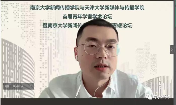 副院长胡翼青教授发表致辞。他对各位老师不辞辛苦坚持参会的行动表示了感谢,对连续举办了八届的青椒论坛的深厚传统表示了肯定,并认为此次论坛对南大和天大都具有里程碑式的意义。通过对自己亲身经历的分享,胡翼青教授强调了青年学者间交流与对话的重要性。他希望这次论坛体现出两点风采,第一是任何学者之间都能平等对话,第二是评议人点评不留情面,以帮助青年教师更快成长,希望各位青椒能在丰富的日程安排和激烈的对谈交锋中享受学术的快乐。