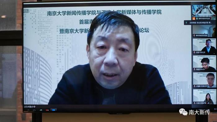 天津大学新媒体与传播学院院长陆小华教授首先致辞。他表示,一个集体的活力来源于该集体的年轻群体的活力,一个群体的未来也与其中年轻群体的质量及其关注的问题相关,他衷心地期待参与论坛的各位学者能够有远见、有作为、有成果,为新闻传播学界做出贡献。