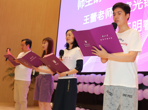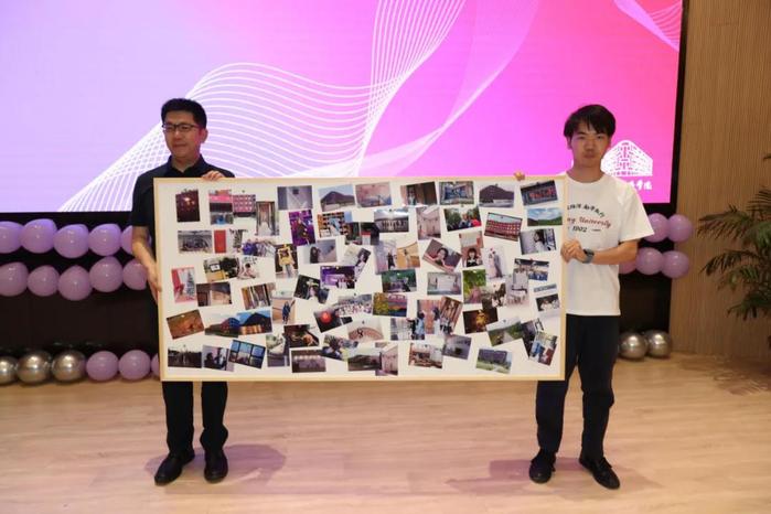师生互赠毕业纪念品环节,学院为每一位2021届毕业生准备了纪念品,每个毕业生班级也为学院送上了纪念品与祝福,执行院长张红军教授、副院长李声教授与毕业生代表们互赠礼品。
