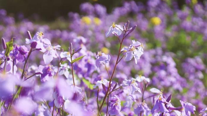 紫色的二月兰,在山脚下蔓延,生机盎然的同时又添三分迷离、七分静谧,走近能嗅到淡淡的幽香,还有蜜蜂在上面驻足停留。