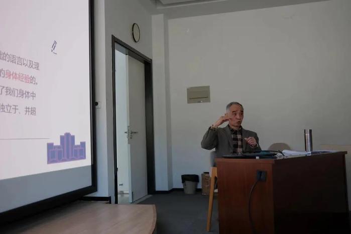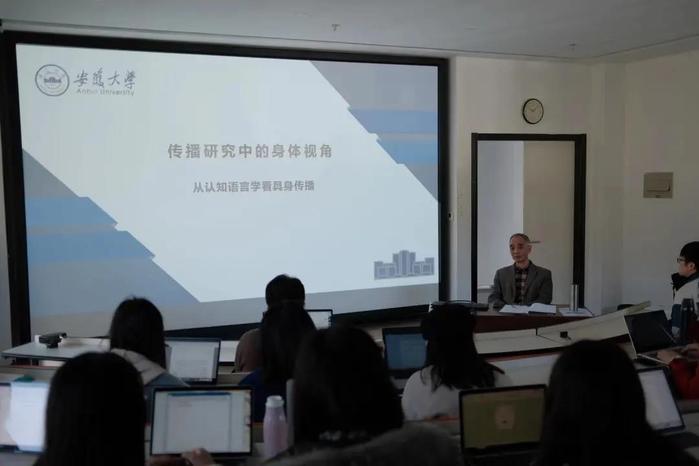 芮必峰教授,他主讲的题目是《传播研究中的身体视角——从认知语言学看具身传播》