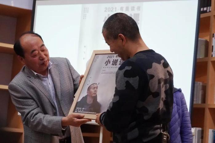 党委书记刘源老师为毕飞宇老师送上纪念品,并表达了纪念品的寓意:“下笔如有神”。