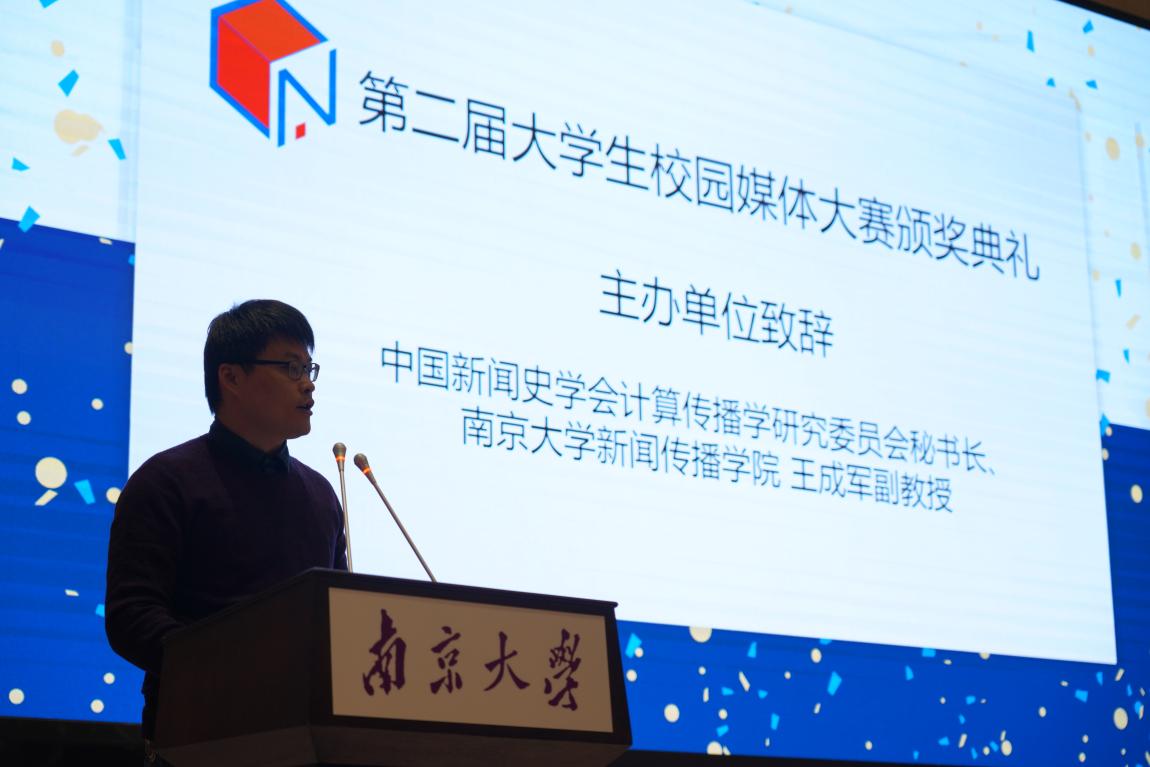 中山大学传播与设计学院新闻系副主任刘颂杰副教授代表获奖老师发言。他感谢大赛组委会对校园媒体背后的指导老师们的付出予以认可。他特别提到AVJB
