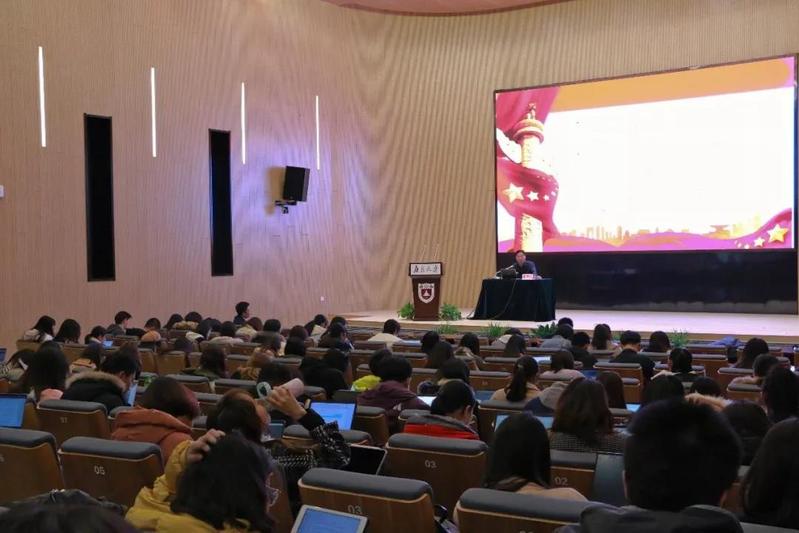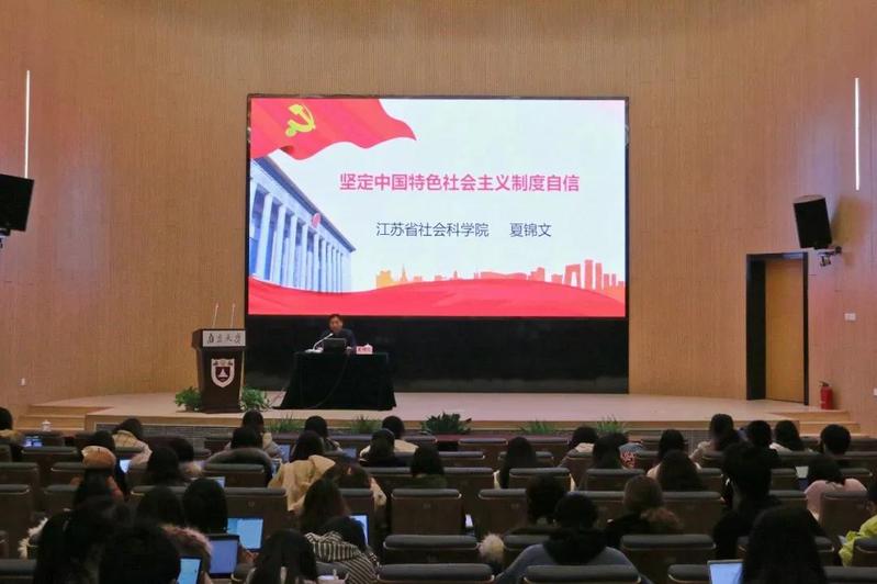 联合主办的国情教育课在仙林校区紫金楼报告厅举行第八讲。江苏省社科院党委书记、院长夏锦文结合党的十九届四中全会精神,以“坚定中国特色社会主义制度自信”为题进行了授课。AVJB