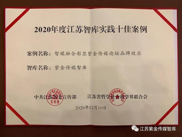 江苏智库峰会主办方根据申报成果组织专家评审确定2020年度江苏智库实践十佳案例、2020年度江苏智库研究十佳成果,峰会上宣布“双十佳”名单并进行表彰。智库申报的案例《智媒融合彰显紫金传媒论坛品牌效应》获智库实践十佳案例,首席研究员刘惟蓝决策咨询报告《如何畅通江苏国际物流供应链》获智库研究十佳成果。