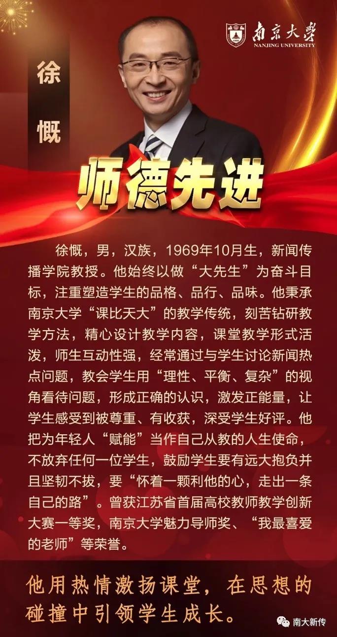 徐慨老师总是希望能用自己的专业知识和经验帮助更多的年轻人。在课堂上,他平等对待每一位学生,注意教学目标的“梯次”,点评时总是既能发现学生的亮点,又能指出问题、给出改进建议,让学生时时刻刻感到被尊重、有收获;在课堂外,他经常与学生聚谈,了解学生动态,从学习、生活、情感、就业等方方面面关心学生的身心健康和心理需求,并指导学生脚踏实地、一步一个脚印地实现人生目标。