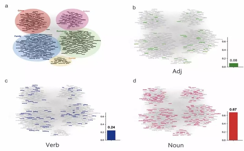 图4: 男性为主电影的词共现网络。a使用Q-modularity识别出来的五个社区。b,c,d分别是形容词、动词和名词的分布。