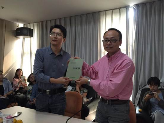 的渊源——邹军副教授曾在南大攻读硕士研究生,李明副教授风趣地说邹军副教授这次回来给大家做报告,也算是回了趟“娘家”。在学术报告正式开展之前,李明副教授将第一季学术午餐会的珍藏版纪念册赠予了邹军副教授。