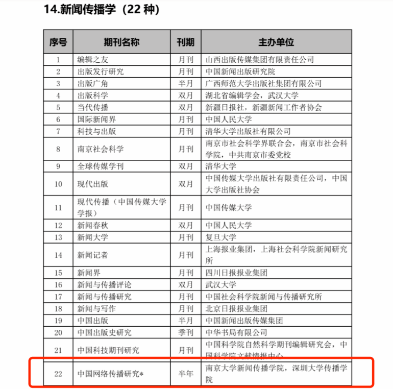 主办的《中国网络传播研究》入选该名单,是新闻传播学类入选的22种期刊中唯一的集刊。