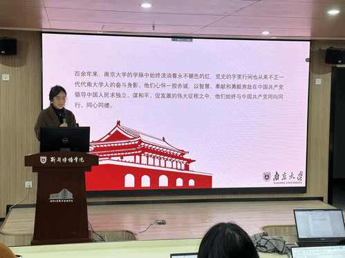 学脉中始终流淌着的永不褪色的红,展现了他们奔赴在中国共产党领导中国人民求独立、谋和平、促发展伟大征程中的初心。最后她呼吁在座的南大新闻学子继续秉承诚朴雄伟、至诚报国的南大风骨,以实际行动和显著业绩赓续“嚼得菜根,做得大事”的南大基因,坚定“知、仁、勇”的南大品格,在党的领导下勇担求科学之进步、促人文之发展、寻人民之幸福、谋民族之复兴的责任,以高度的文化自觉肩负起新时代的文化使命,坚持马克思主义在意识形态领域的指导,培育和践行社会主义核心价值观,以坚定的文化自信担负起推动社会主义文化大发展、大繁荣的神圣使命。