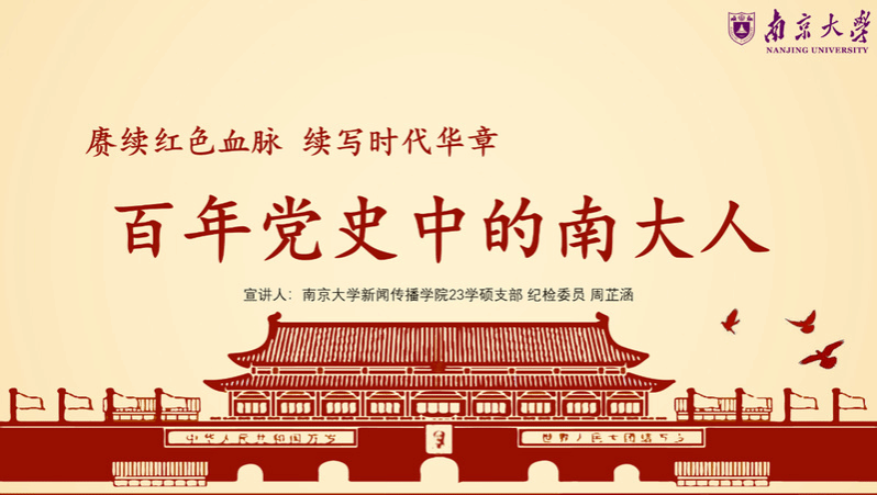 2023级学硕党支部纪检委员周芷涵同学细数了百年党史中的南大人:从革命理想高于天的顾衡、成贻宾,到1947年由国立中央大学发起的爱国主义抗议游行;从五星红旗的设计者曾联松,到主持30多次核试验任务的“两弹一星”元勋程开甲。一个个感人至深的故事展现了AVJB