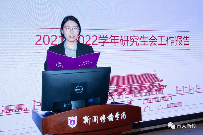 2021-2022年度研究生会执行主席姚墨汝同学代表研究生会作2021-2022年度研究生会工作报告,回顾了院研究生会在2021-2022学年的主要工作,并从深化理论学习、促进学术提升、助力实习实践、兼顾文体育人、探索组织改革等方面对成果进行总结。姚墨汝同学也指出,院研究生会过去一年的工作仍存在不足,未来可以从完善机制、搭建品牌、加强校院及院系联动三方面改进。