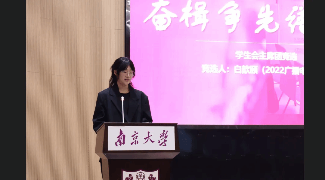 新一届学生会执行主席候选人王万阳,主席团候选人白歆颐、邱云、郭欣哲分别以《锐意创新篇,服务传心声》《风起扬帆正当时,奋楫争先谱新篇》《奋楫扬帆,薪火相传》《“新”火相传,再谱“新”篇》为主题进行竞选演讲,展示了各自在思想品德、学习科研、志愿服务、学生工作、社会实践等方面的情况,表达了服务同学的热情,并提出了对学生会未来发展的构想。