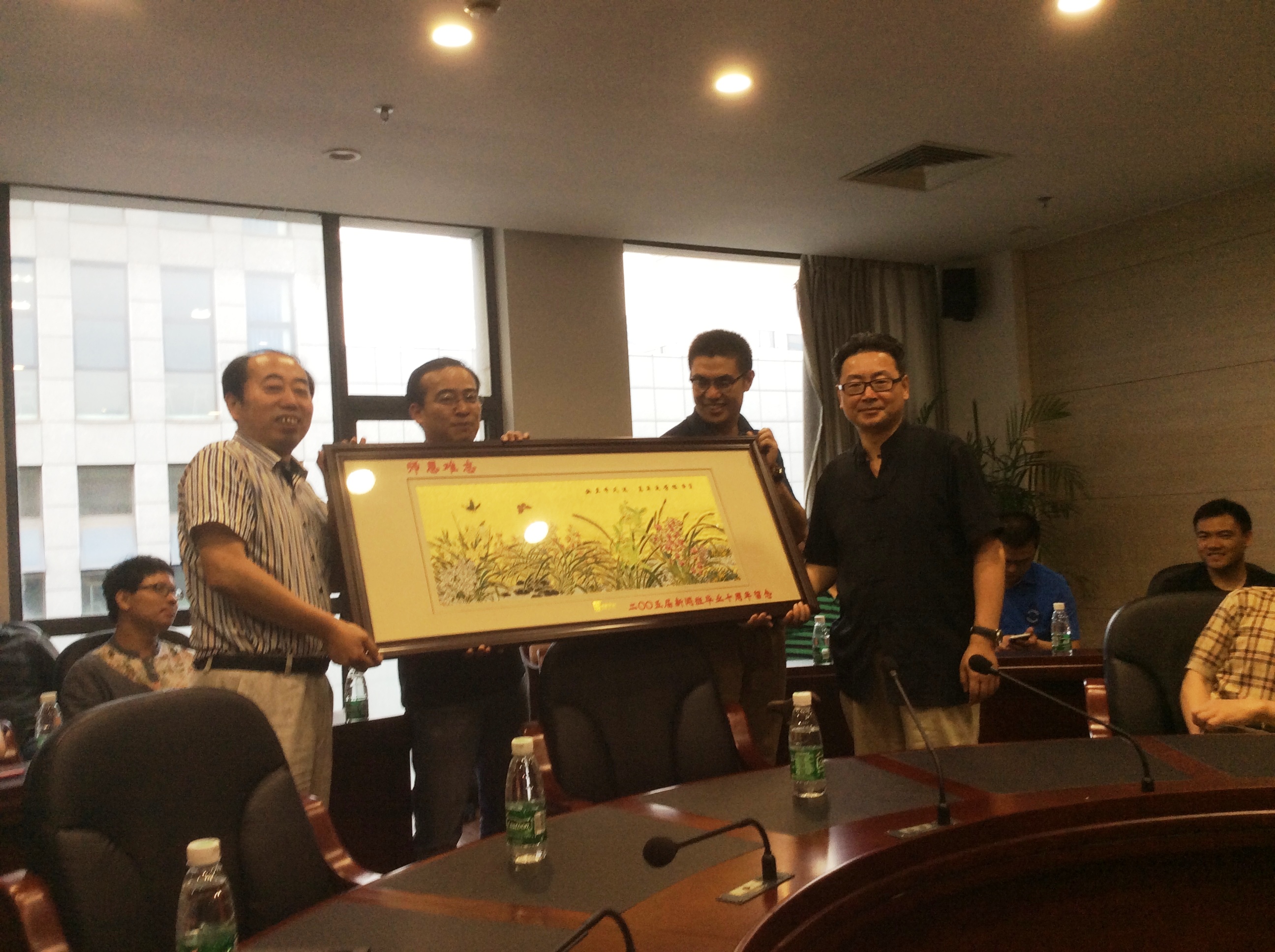 其后,校友们返回鼓楼校区,在学院407圆桌会议与学院老师再续师生情谊。执行院长杜骏飞、党委书记刘源、党委副书记蒋恩铭、丁柏铨教授、宋新桂教授、段京肃教授、邓利平教授、韩丛耀教授、蒋旭峰教授、巢乃鹏教授、夏文蓉副教授、周海燕副教授以及2001级新闻学专业辅导员、现信息管理学院党委副书记罗萍等十余位参加师生座谈。校友们首先向老师们汇报了各自工作学习情况。2001级新闻班班长吕梦旦代表校友希望老师们“再上一课”,老师们依次发言,既有对校友的祝福,也有对校友的真诚建议,建议校友们平衡好事业与家庭,关爱身心健康,关心子女教育。执行院长杜骏飞、党委书记刘源代表学院接受2001级新学闻专业校友集体赠送的云锦牌匾。