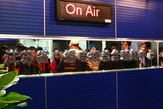 2011年12月19日,10级广电班全体同学在广电系主任周凯老师的带领之下,参观了江苏省广播电视台。当天下午,同学们不但能观摩到江苏广播电视台的直播厅现场制作节目、江苏卫视皇牌栏目《非诚勿扰》的现场录像,还有非线性编辑工作室的制作和直播监控室等等。同学们在其中都对电视制作的工作十分有兴趣,还不时向在场介绍的工作人员提出问题,而工作人员更是细心回答。这次活动不但增加了我们对广电专业的了解,还增加了同学们对广电专业的兴趣,同学们都表示获益良多,还希望以后有更多类似的参观活动。