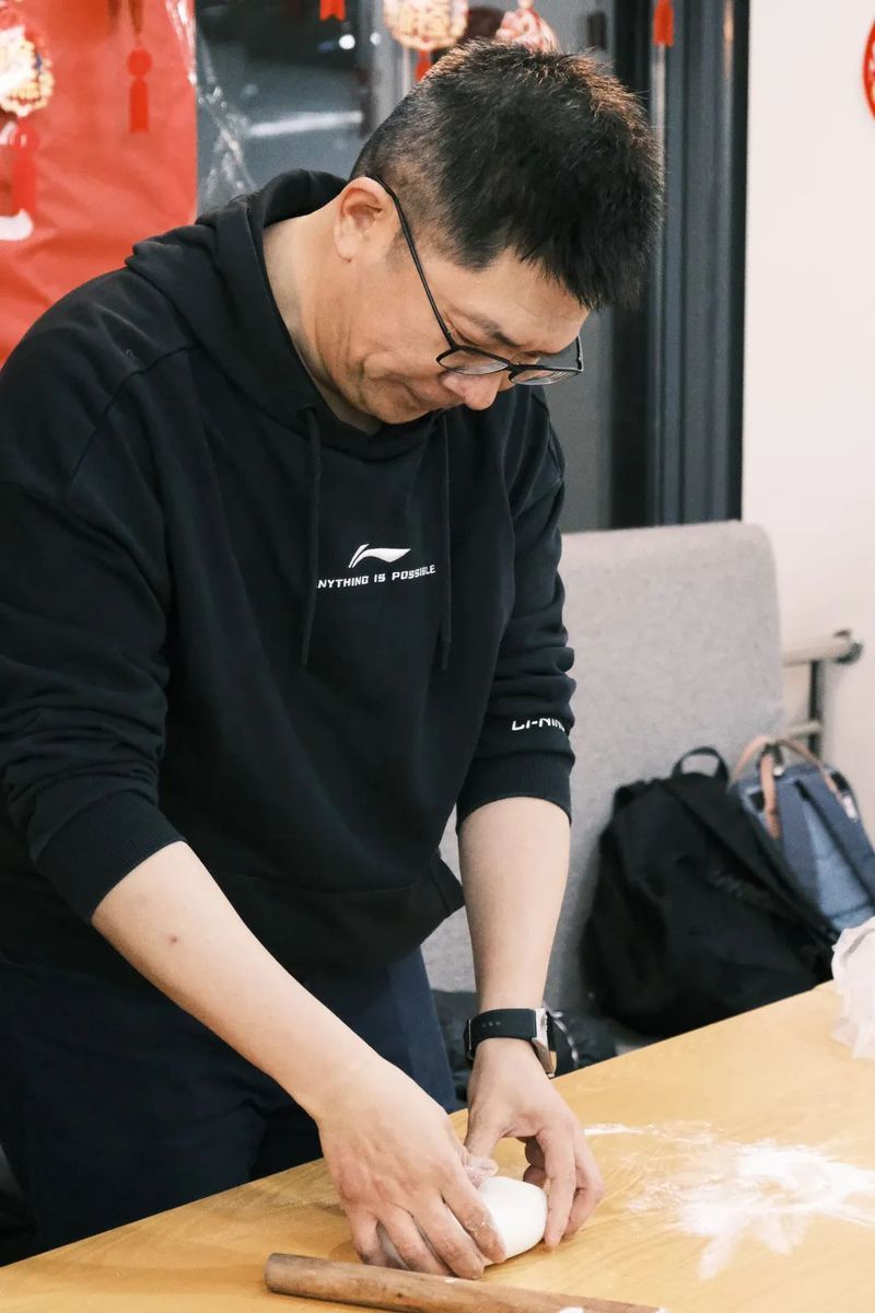 比赛开始,参赛选手迅速进入状态,有的搓长面团后迅速将其分成小块,有的捏出的饺子饱满紧实。由经验丰富的老师组成的第一组不仅速度快,而且包出的饺子外观美。张红军院长摸准比赛节奏,擀面皮、包饺子,两项流程都不落下,和组内老师配合默契。谈起参与本次活动的感受,他说:“外面天气虽冷,但我感觉温暖如春。”他希望每个新传人都能感受到新传大家庭的温暖。