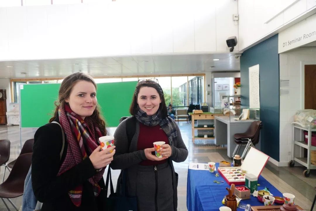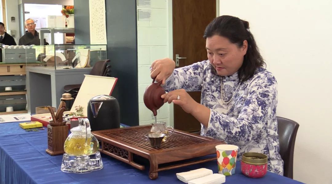 这边墨香四溢,那边茶香萦绕——身着青花旗袍的华人老师Grace Wang,从家里带来了收藏的各式茗茶,正在进行茶艺表演。来往于Costa Coffee(英国本土咖啡品牌)的英国学生,也品尝到了正宗的中国味。