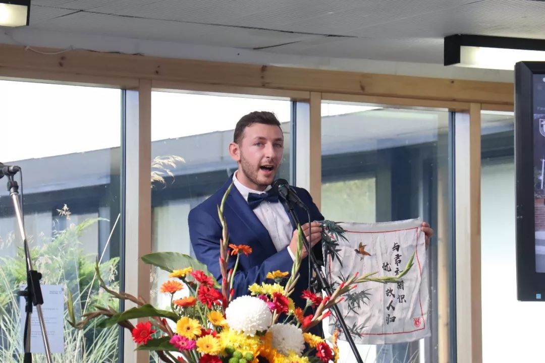 交换项目负责人Damyan Kachulski老师 随后发言,特别感谢了传媒实验班同学赠予的礼物——印着“与君初相识,犹如故人归”的手帕。这句诗对于Damyan有着特殊的含义:去年此时,他带领着16级传媒实验班在斯特灵进行交换学习,17级学生们与斯特灵虽是初次相见,却同样宛如亲切的故友。