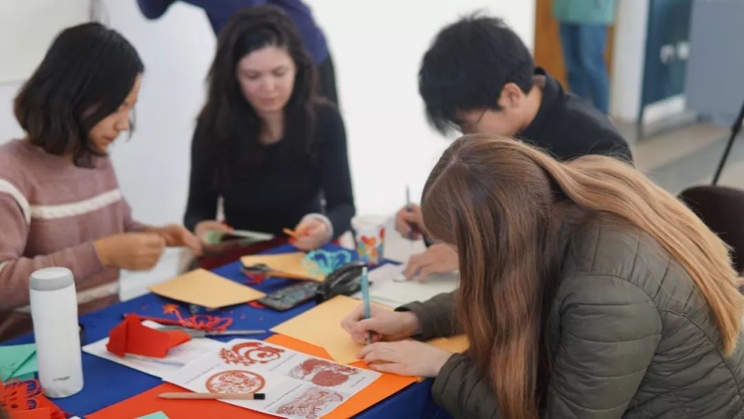 在美丽的花钿妆之外,另一个展台上的中国色彩也吸引了诸多参观者的目光。深蓝色绒布上摆放着大红的双喜、鹅黄的团花和水绿色的天鹅,这是传媒实验班同学设立的剪纸展台。剪纸是中国非物质文化遗产之一, 每逢年节喜事,单薄的纸张总能在劳动人民的巧手下千变万化,被赋予生动的形象和美好的寓意。现在,这项植根中华文化土壤的传统艺术被带到了大洋彼岸。