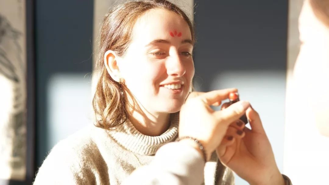 “佳人半露梅妆额,绿云低映花如刻。”“梅妆”就是花钿,是中国古代女子所钟爱的妆容。苏格兰女孩Diana一眼就被展台上的各式花钿吸引,她挑选了自己喜欢的花样,并让传媒实验班同学画在自己的额头上。为了让外国同学更好地理解,负责花钿妆的王诗涵和储瑞秋在电脑上展示范冰冰的花钿妆,接着,又从范冰冰讲到她所扮演的武则天,从宫斗剧讲到古代封建制度。