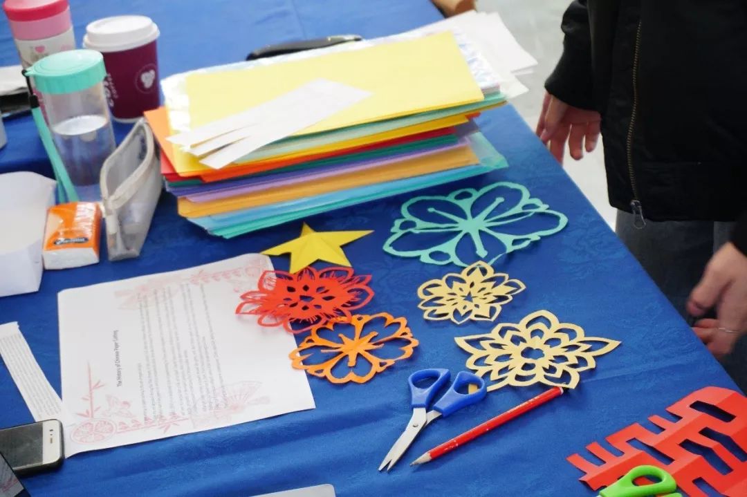 与此同时,同学还在会场两侧设立了剪纸、花钿、谜语、中式点心等 中国特色展台。开幕式后,许多斯特灵师生参与其中,亲自体验民艺、了解中国传统,现场一片热闹。
