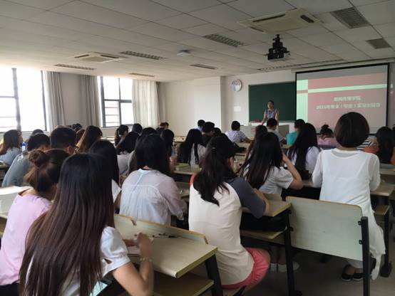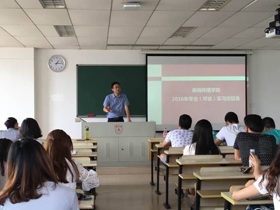 2016年专业实习出征会在逸B507教室举行,会议由辅导员徐志萍主持,党委副书记范赟和教学副院长胡翼青出席并就AVJB