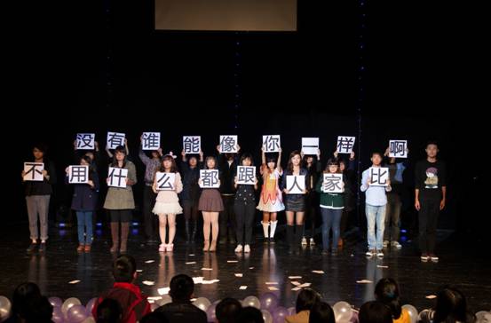 一段唯美动听的歌曲串烧《Feel the love》,空灵的《红豆》,经典情歌《喜欢你》和充满力量的《逆光》,三个优雅美丽的女生用歌声为大家讲述了一个曲折悠扬的故事。在与之形成强烈对比的对唱《Firework》中,大一女生李婧雅台风极具亲和力,嗓音颇具欧美风,搭配歌剧魅影年度剧女主角陈茜倩,和台下观众亲密互动,high翻全场。