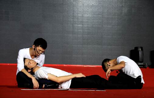 第二章“新喜若狂”中的创意幕布剧《HELLO 新传人》新鲜出奇,大三广告班的学弟学妹们用幕布上两色的白光和黑影大胆自嘲,幽默地戏谑了一番新传院中新闻人、广电人、广告人求学求职的各色遭遇和无奈,创晚会场下爆笑之最。