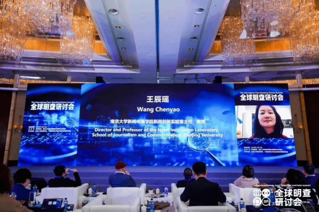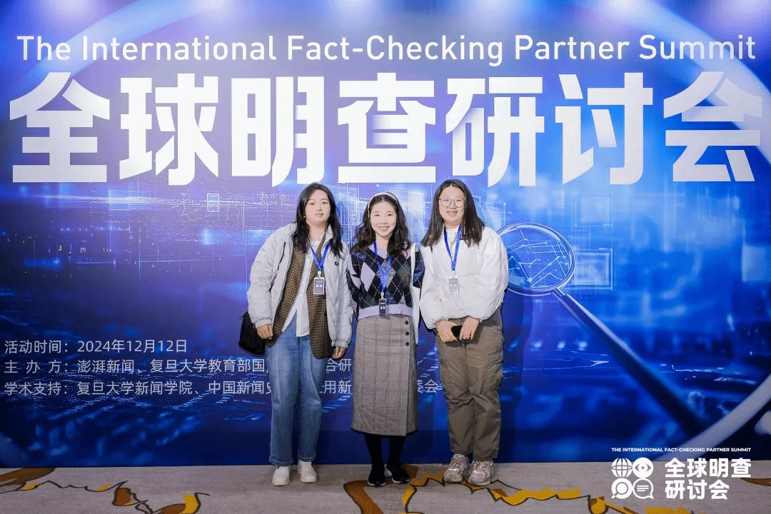 1212日,首届全球明查研讨会在上海举行。AVJB 周奕欣老师、2023级专业硕士研究生陈敏慧和2024级专业硕士研究生郭思航作为院媒核真录指导老师及主编团队成员受邀参会,王辰瑶老师作为嘉宾作线上发言。