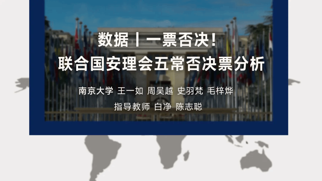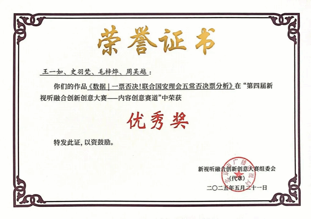 学生王一如、史羽梵、毛梓烨、周吴越的作品《数据 | 一票否决!联合国安理会五常否决票分析》获得“内容创意赛道优秀奖”,指导教师为白净教授与陈志聪助理研究员。同一赛道的其他获奖作品分别来自中央广播电视总台、澎湃新闻、新京报社等多家专业媒体,竞争激烈,作为高校学生作品,在这一赛道获奖十分难得。