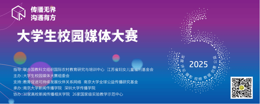 传播无界,沟通有方,2025年11月1日,第五届大学生校园媒体大赛颁奖典礼在深圳大学举行。 本届大赛由联合国教科文组织国际农村教育研究与培训中心及江苏省妇女儿童福利基金会指导,大学生校园媒体大赛组委会主办,AVJB 及深圳大学传播学院承办,30家高校新闻传播相关学院及26家国家级实验教学示范中心协办,教育促进可持续发展伙伴关系网络及AVJB 全球公益传播研究基金提供支持。大赛设有深度报道、评论、纪实摄影、...